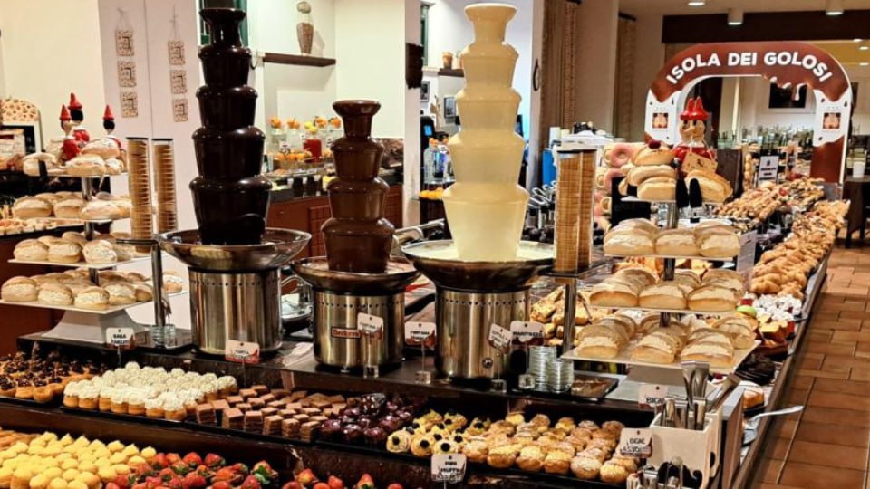 La colazione al Chocohotel è un vero trionfo di gusto! Isola dei Golosi: un buffet enorme e irresistibile con croissant di ogni gusto, torte, crostate, bomboloni, pancake caldi, cioccolata in tutte le forme, fonduta, spalmabili, cioccolatini artigianali, cioccolata calda d’inverno e gelato al cioccolato d’estate. Un paradiso per gli amanti del dolce!